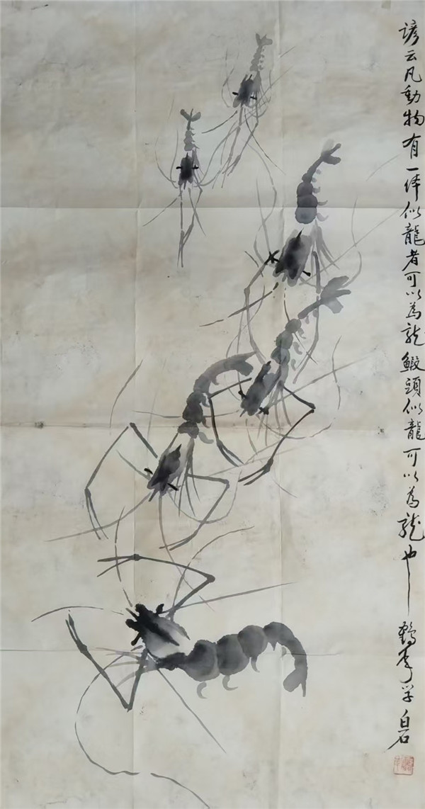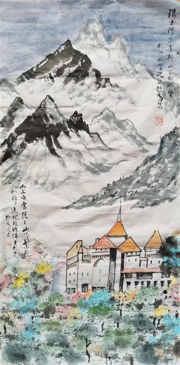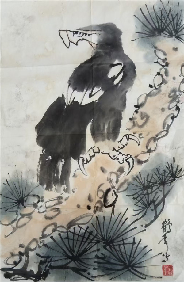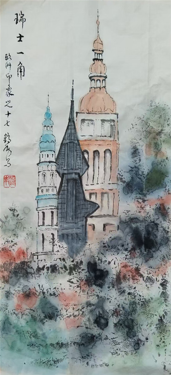 笔墨当随时代。汪鹤年的书画艺术于尺幅之间尽显文化厚度与创新胆识。在绘画领域,他兼擅山水、花鸟、走兽,且能将西方景观纳入东方笔墨体系。如国外建筑写生小品,以中国水墨的氤氲晕染表现欧洲建筑与山川,是对 “外师造化,中得心源” 古训的当代诠释 —— 他的 “造化” 不局限于本土山水,而是以全球视野拓宽了水墨的表现疆域,让中国画的抒情性与西方景观的写实感达成微妙平衡。其花鸟、走兽亦具特色,《松鹰图》以浓淡枯湿的墨色塑造鹰的雄健,松针如刀,颇得八大山人冷逸之态却又自出机杼;《双马图》设色明快,马的神骏跃然纸上,有 “一洗万古凡马空” 的气韵;《群虾图》师法白石老人而不失个人风貌,虾的灵动通透尽显笔墨功力,正如谢赫 “气韵生动” 的画理追求,在他笔下是对传统笔墨语言的娴熟驾驭与生命意趣的鲜活表达。