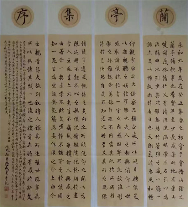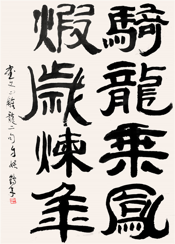书法创作上,他的楷书《兰亭序》四条屏,端雅方正,尽显王字风流,契合 “晋人尚韵” 的审美品格;隶书作品《骑龙乘凤 煆岁炼年》,结体宽博,笔力雄健,得汉隶古朴厚重之美。他的书法并非对古帖的简单摹写,而是在对 “法” 的深入理解中融入个人性情,正如孙过庭《书谱》所言 “通会之际,人书俱老”,汪鹤年的书法正走在这条追古开新的路上。
