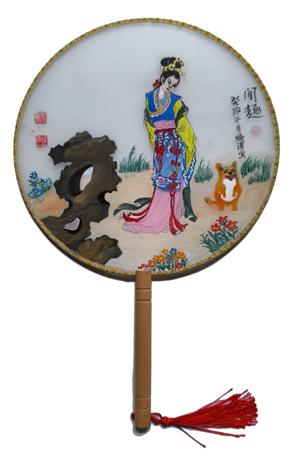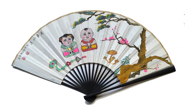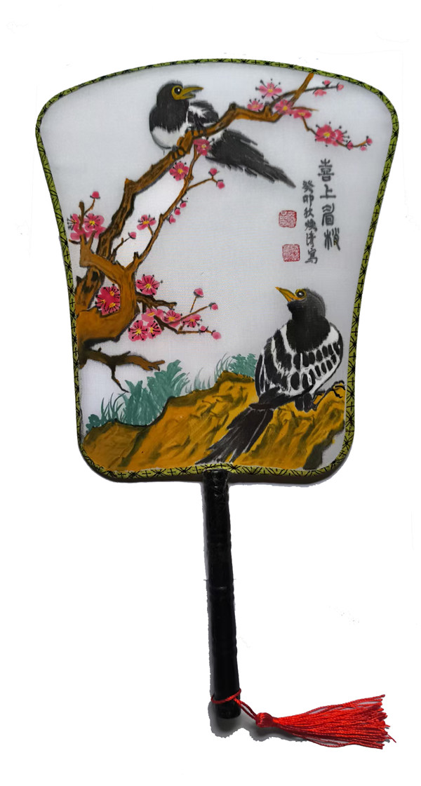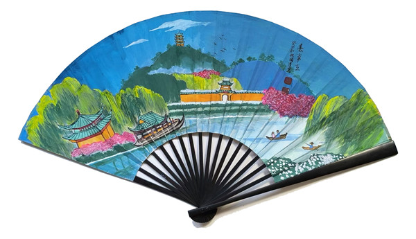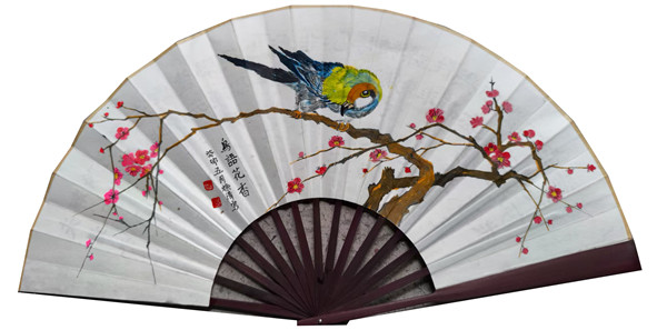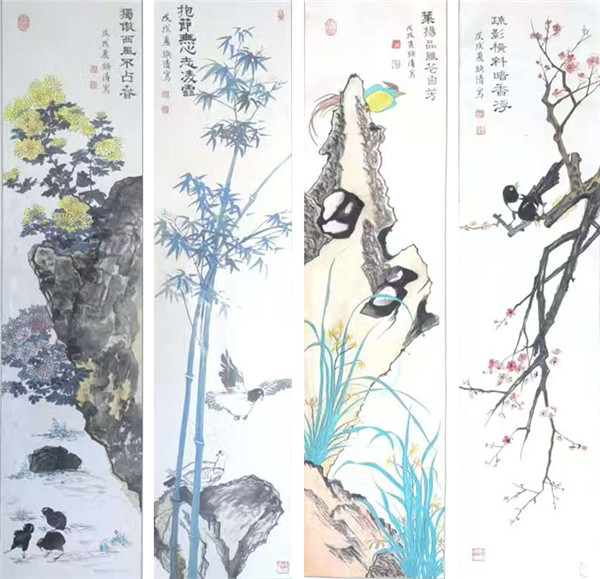 在绘画领域,他的花鸟、山水作品尽显传统写意精神。如扇面《黄鹂迎春》与团扇《喜上眉梢》,以鸟雀的灵动、花枝的绰约,传递出 “感物吟志” 的文人画旨趣。那组梅兰竹菊四条屏,更是对 “四君子” 文化符号的精妙演绎,竹之劲节、菊之隐逸、兰之幽芳、梅之傲骨,在笔墨间被赋予人格化的审美意象,契合宋代邓椿 “画者,文之极也” 的论断,于具象描摹中寄寓情志。其山水扇面《春到玄武》,则以明快色彩勾勒江南胜景,亭台楼阁、湖光山色的布局,暗合 “可望可行,可游可居” 的山水审美传统,又融入现代视觉的明快张力,展现出对传统山水范式的创新表达。