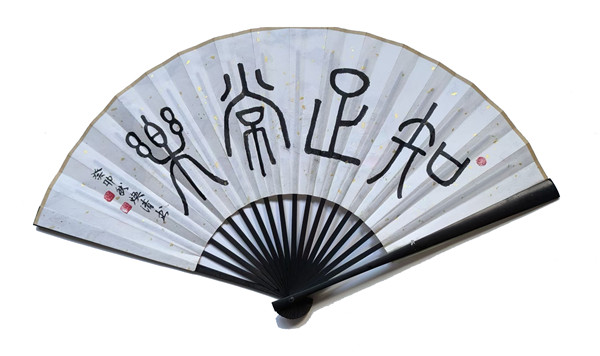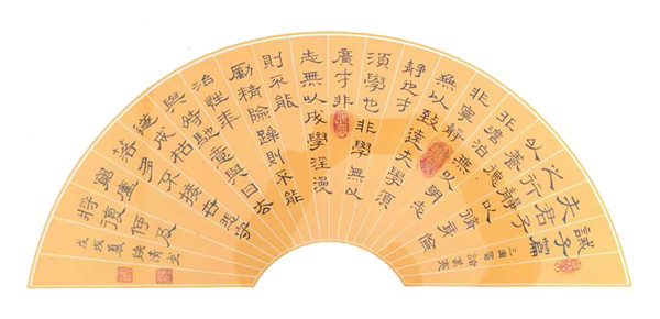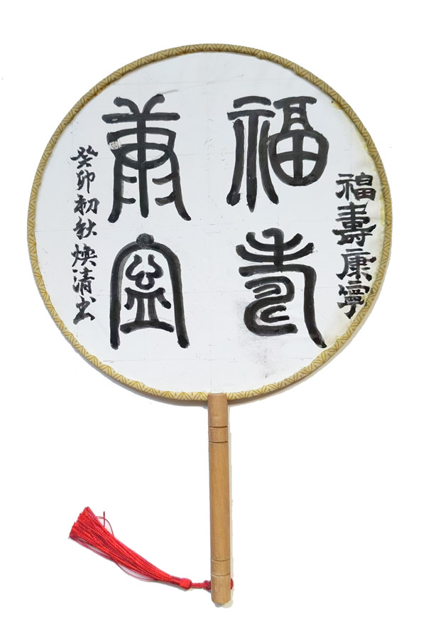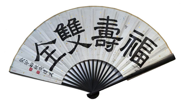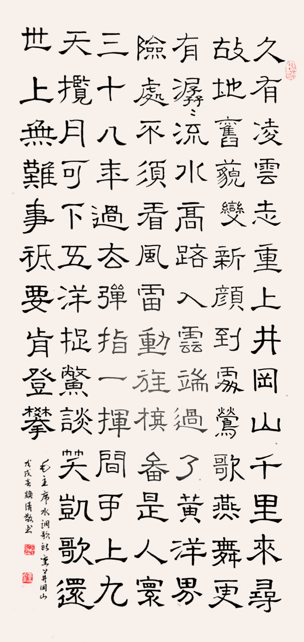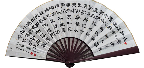 书法创作上,他兼涉多体,尤见功力。隶书作品结体方正,笔力沉雄,得《张迁碑》之古朴厚重,又具自身金石韵味,印证了 “作字先作人,人奇字自古” 的书道真谛。楷书《枫桥夜泊》,法度严谨,点画精到,尽显唐楷端雅之风,体现出他对 “书法以用笔为上,结字亦须用功”(米芾语)的深刻践行。还有那幅扇面书法,字迹清隽,布局雅致,于咫尺之间展现笔墨的节奏与韵律,是 “意在笔先,字居心后” 创作理念的鲜活呈现。