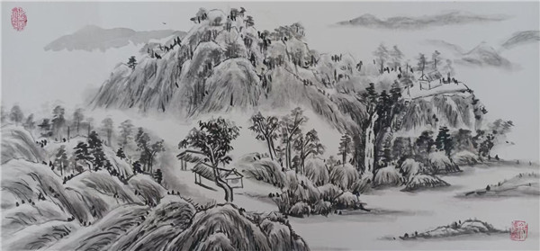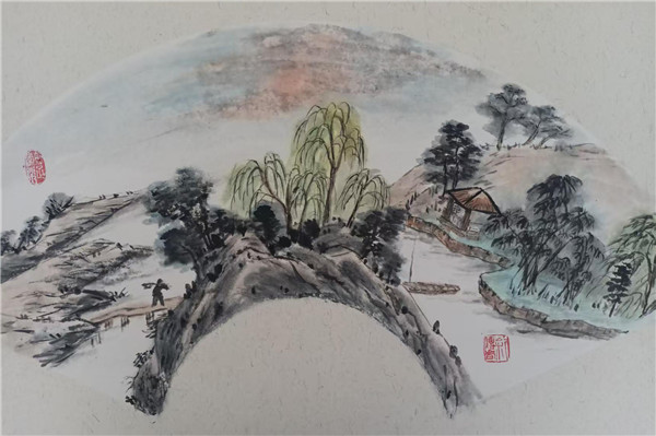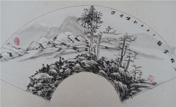在山水作品中,草木敷色清雅,山石皴法颇具古韵,契合 “画山水,先取气韵” 之论,画面气息温婉雅致;或于雄奇山势间营造出朦胧意境,笔墨苍润,有 “笔墨当随时代,气韵必传古今” 的思考;扇面山水和大幅水墨山水,在章法布局上体现了 “咫尺千里” 的空间追求,尤其是水墨山水的留白与墨色层次,尽显你对 “墨分五色” 的理解与运用,于黑白灰的交织中构建出悠远山水意境。