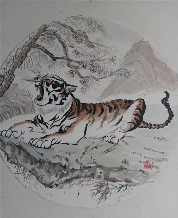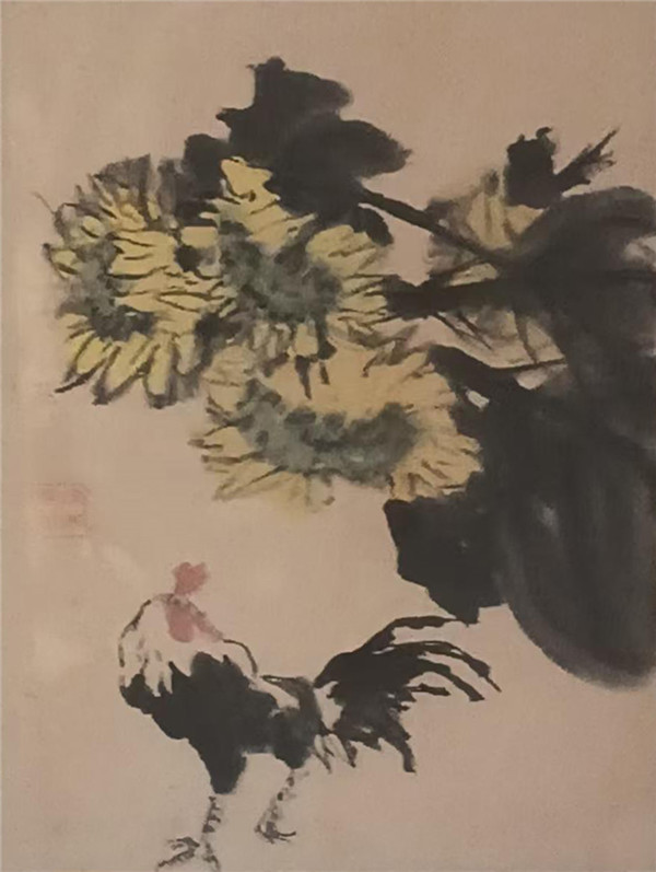 在花鸟作品里,笔墨恣肆灵动,如公鸡造型简括传神,向日葵墨色浓淡相宜,颇得 “写意者,墨色飞扬,意趣横生” 的旨趣,可见她在花鸟写意的笔墨表现力上已经有扎实的功底。
