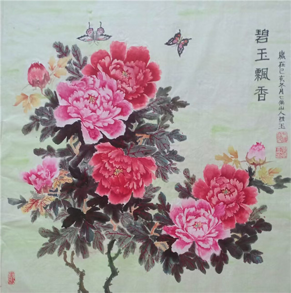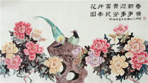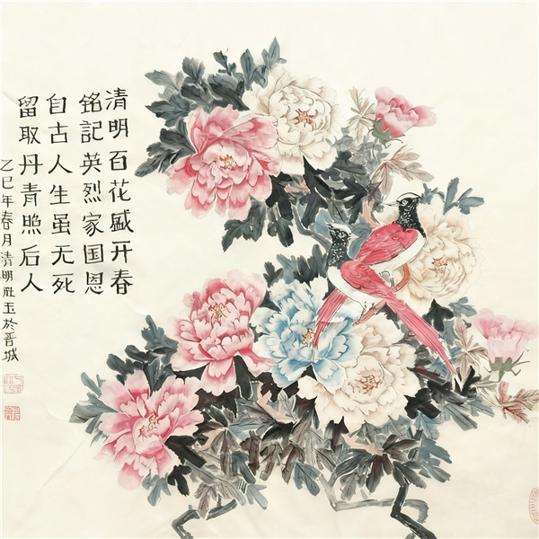 在题材取向上,他尤擅牡丹、禽鸟、松石等经典意象。牡丹之作如《碧玉飘香》,设色秾丽却不艳俗,花瓣层次通过水墨晕染与色彩叠加尽显 “花中之王” 的雍容,契合宋代画论 “写花者,须形神兼备,色韵俱佳” 的要求,将牡丹的富贵气象与雅致格调融为一体。其笔下禽鸟如《花开富贵迎新春》中的雉鸟、《清明百花盛开春》里的绶带鸟,造型工致而不失笔墨意趣,于勾勒点染间传递出 “禽鸟飞鸣,皆有生意” 的生动性,暗合五代黄筌 “翎毛骨气” 的审美追求。