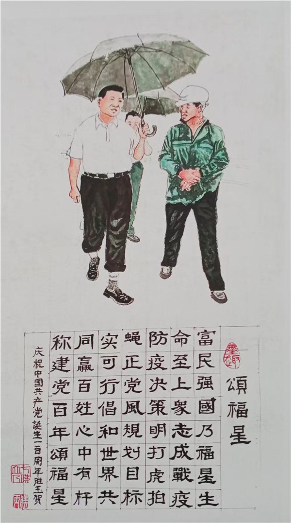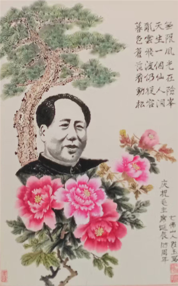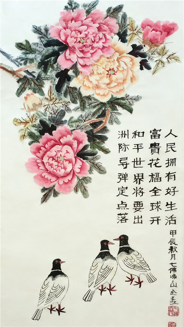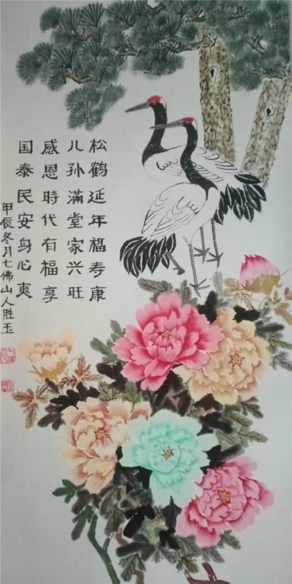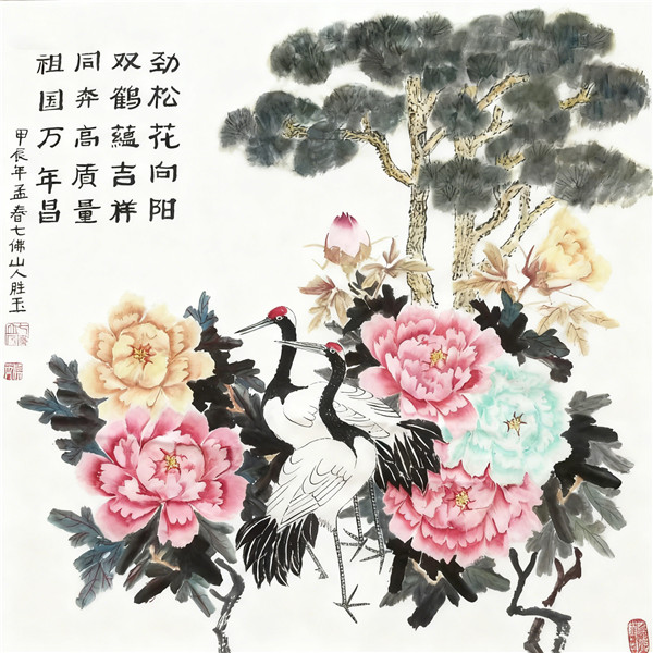 在艺术表达上,李胜玉深谙 “书画同源” 之道,题款书法朴拙苍劲,与画面笔墨相得益彰。如《人民拥有好生活》的楷书题跋,结体端稳、笔力沉雄,既点明作品对和平生活的祈愿,又以书法线条的质感强化画面的艺术张力,呼应元代赵孟頫 “书画本来同” 的艺术主张。同时,他注重以物寄情,借牡丹的繁荣、白鸽的和平、松鹤的长寿,将个人对家国昌盛、民生安乐的期盼融入创作,使作品超越传统花鸟的审美范畴,具备了当代人文关怀。