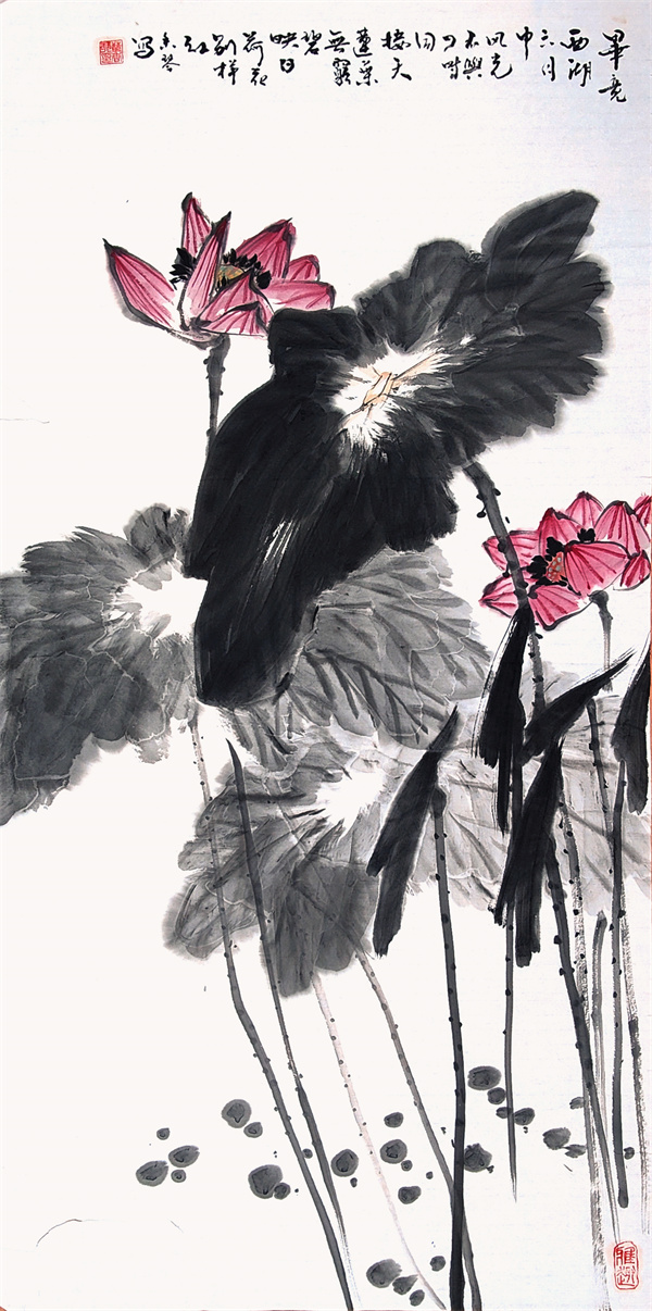 董香琴的写意花鸟,是墨彩与心性的交融,在传统文人画的骨脉里,生长出鲜活的当代气息。她笔下的荷,得八大山人之简逸却不冷寂,墨叶如泼,焦墨与淡赭交错出莲瓣的明丽,“出淤泥而不染” 的古意,化作笔锋的泼辣与色彩的温煦,是清雅与热烈的共生。或以疏朗之笔写一花半叶,墨色浓淡间藏着徐渭的纵逸,却以淡彩点染出柔婉,让 “野逸” 多了几分秀润。