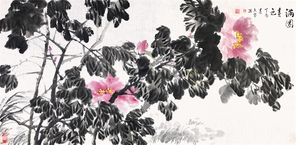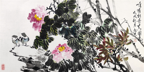 其梅竹之作最见其笔墨风骨。竹取郑燮 “冗繁削尽留清瘦” 之意,竹竿以焦墨劲扫,竹叶如剑戟错落,留白处见 “气骨”;梅枝虬如铁而花妍若霞,是 “老而弥秀” 的写意精神,题款 “香魂” 又添几分柔情,打破了文人画的刚硬刻板。牡丹系列更显其 “以情入画”。花团以胭脂泼写,艳而不俗,枝间双雀灵动,是 “富贵” 与 “生机” 的和解;以浓墨写叶、淡粉点花,墨气淋漓中见宋人 “格物” 的细腻,却以写意笔法脱了院体的匠气。