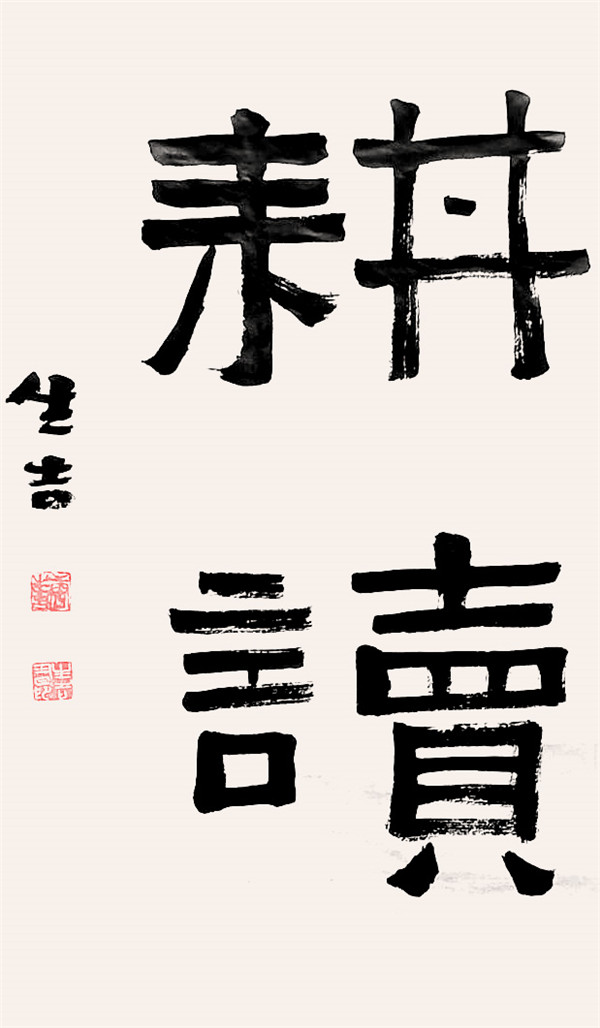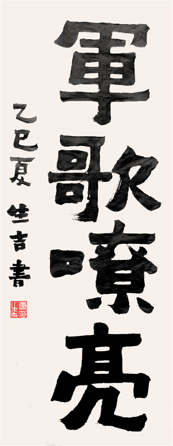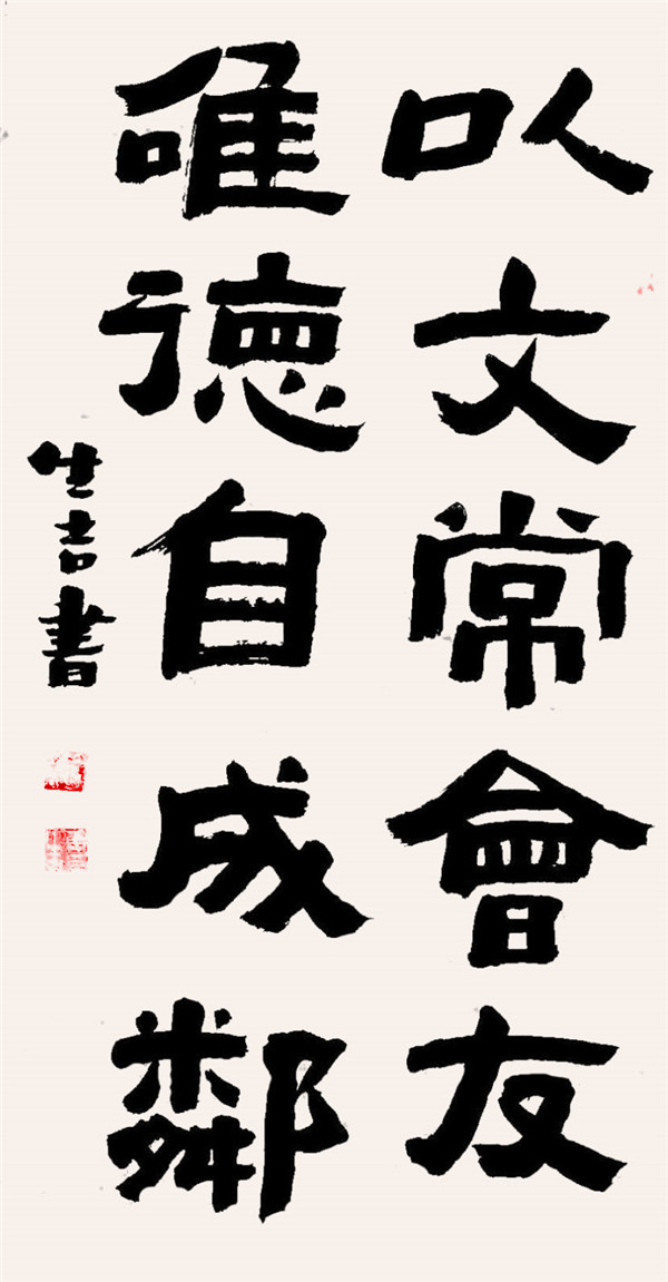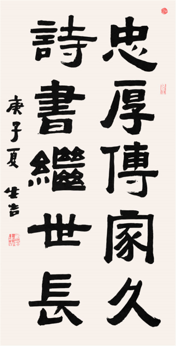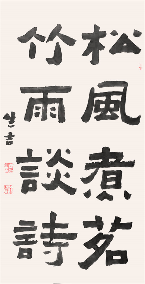 仔细品味他的书法,在汉隶中吸取丰富营养,旁及魏、晋,又涉列唐、宋、元、明、清各名家法帖,心摹手追,收获颇多人生感悟。面对他的作品,你会感到高古、厚重、拙朴而温文尔雅,一股清新古雅之气呼之欲出,流淌出一种睿智的光芒,充满了力度感、立体感,还有时代感。其作品的神、气、韵都表现得淋漓尽致。