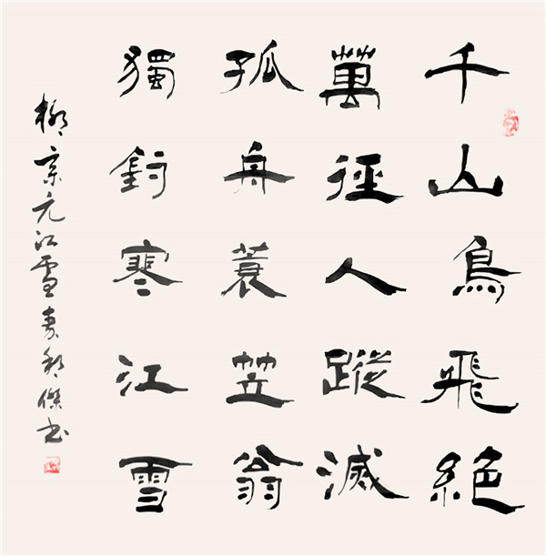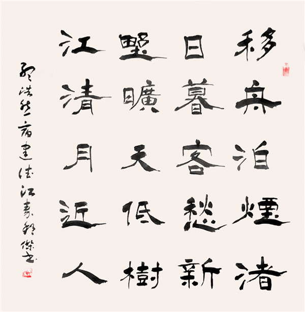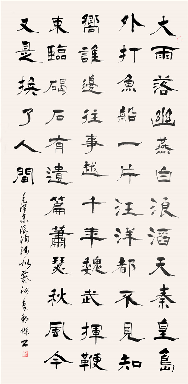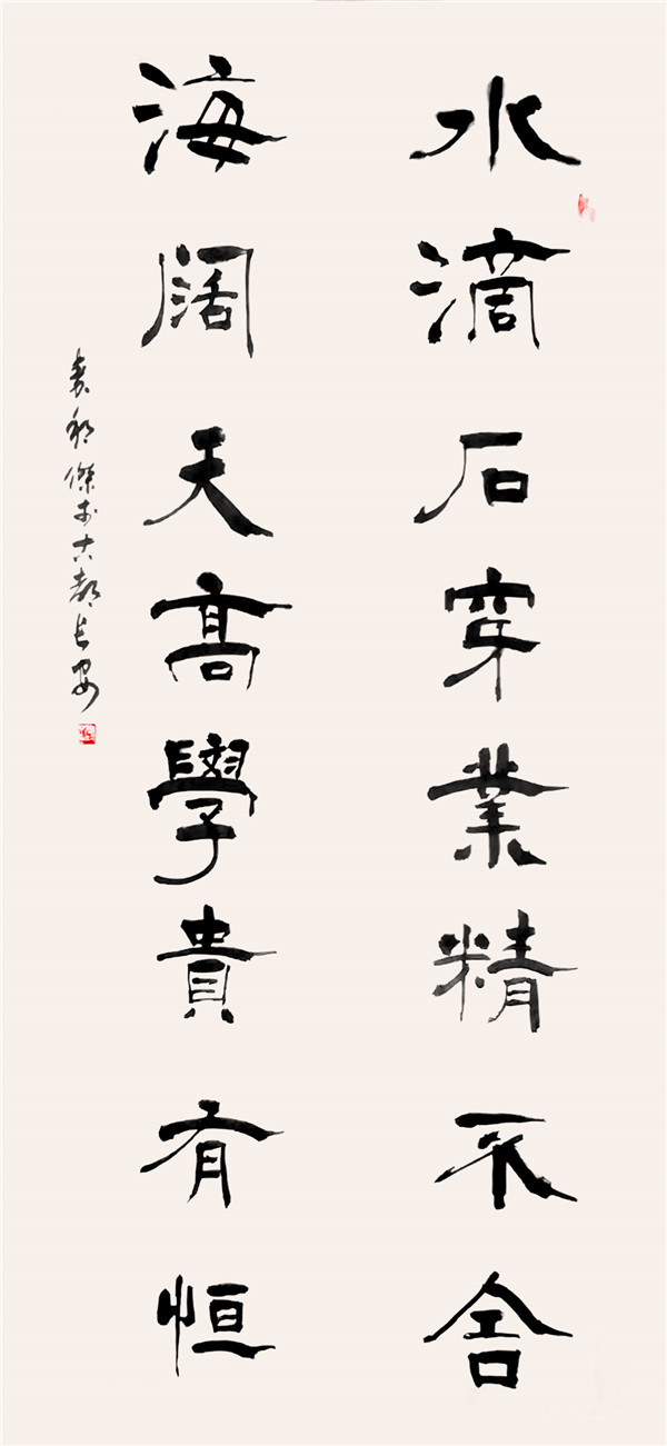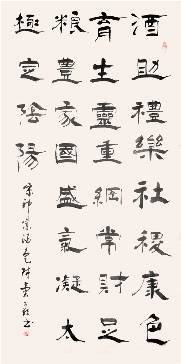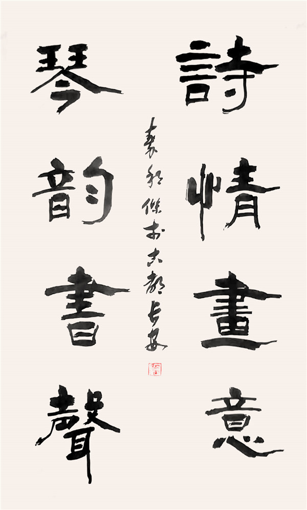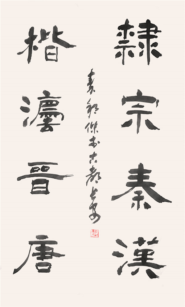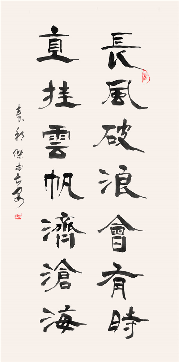 秦邦杰的书法,以隶书为基,却不囿于隶;以传统为宗,却不泥于古。他在碑帖交融的探索中,让汉隶的古朴与时代的审美相遇,既承续了 “书肇于自然”(蔡邕《九势》)的本源精神,又拓展了隶书在当代的表现维度,实为当代书坛 “守正创新” 的典型实践之一。
