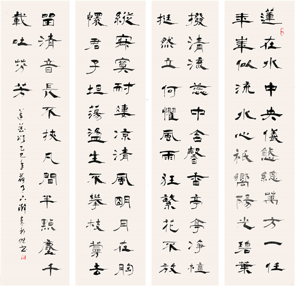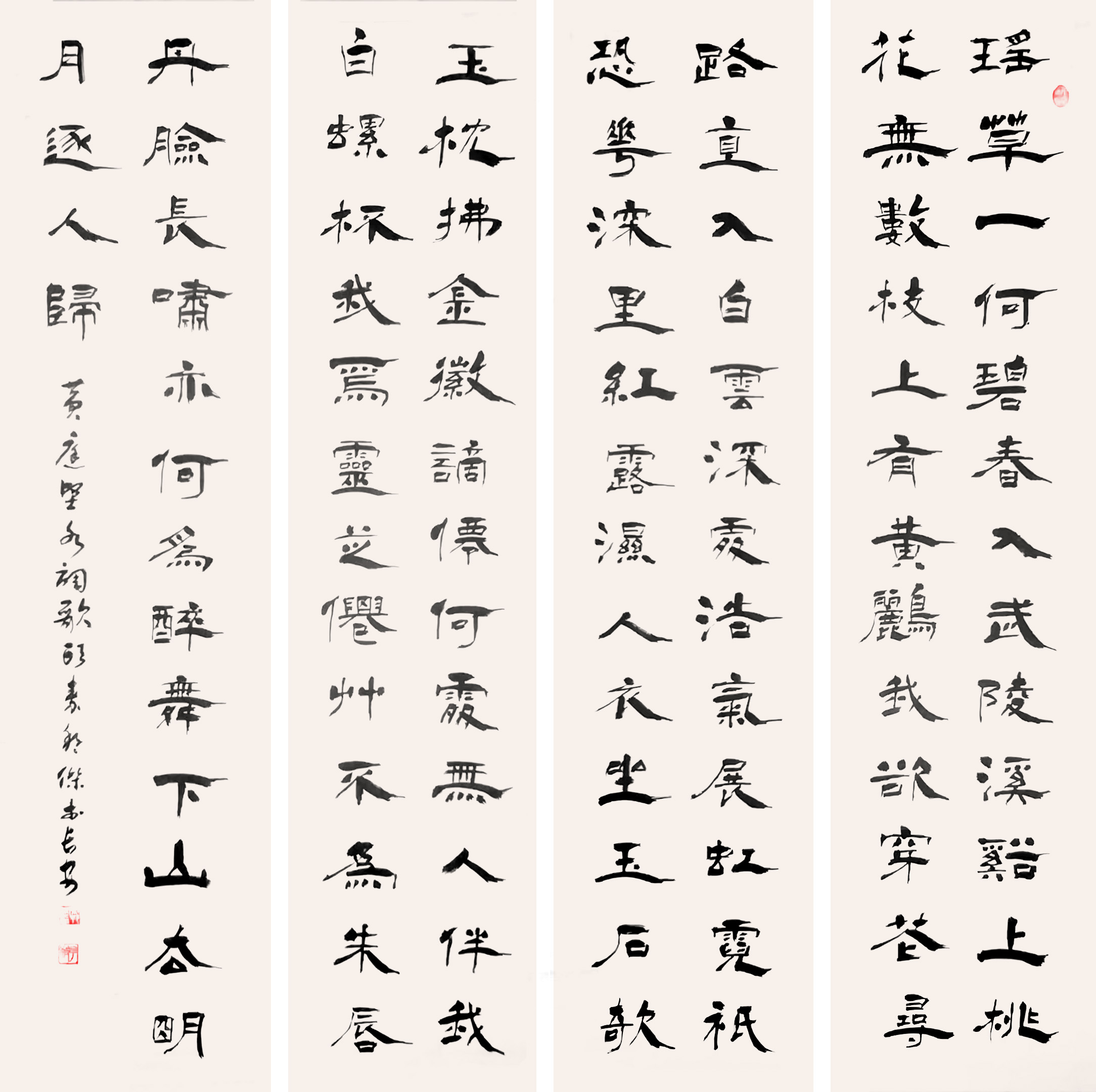 章法布局上,他能因势赋形,小至斗方、对联,大至条屏、长卷,皆气脉贯通。如四条屏书古典诗词,字与字、行与行之间 “疏密得宜,虚实相生”,既具汉碑整饬之态,又含行草流贯之韵,恰如蔡邕所言 “书者,散也,欲书先散怀抱”,于笔墨排布中见性情抒发,于形式经营中显文化意蕴。