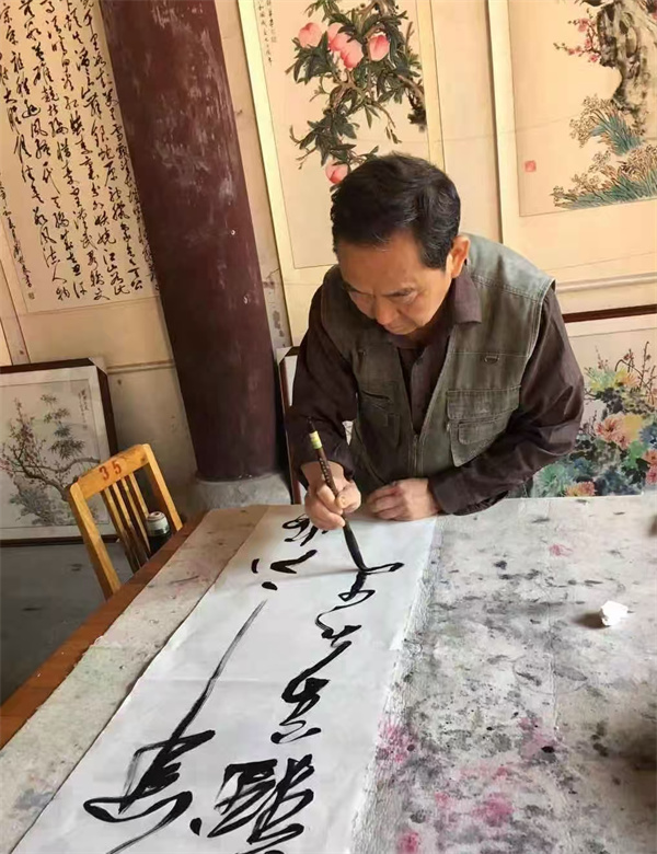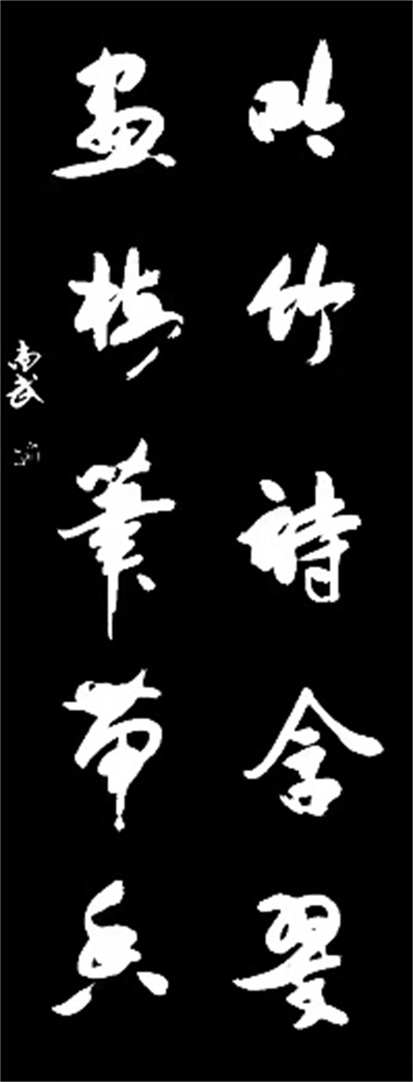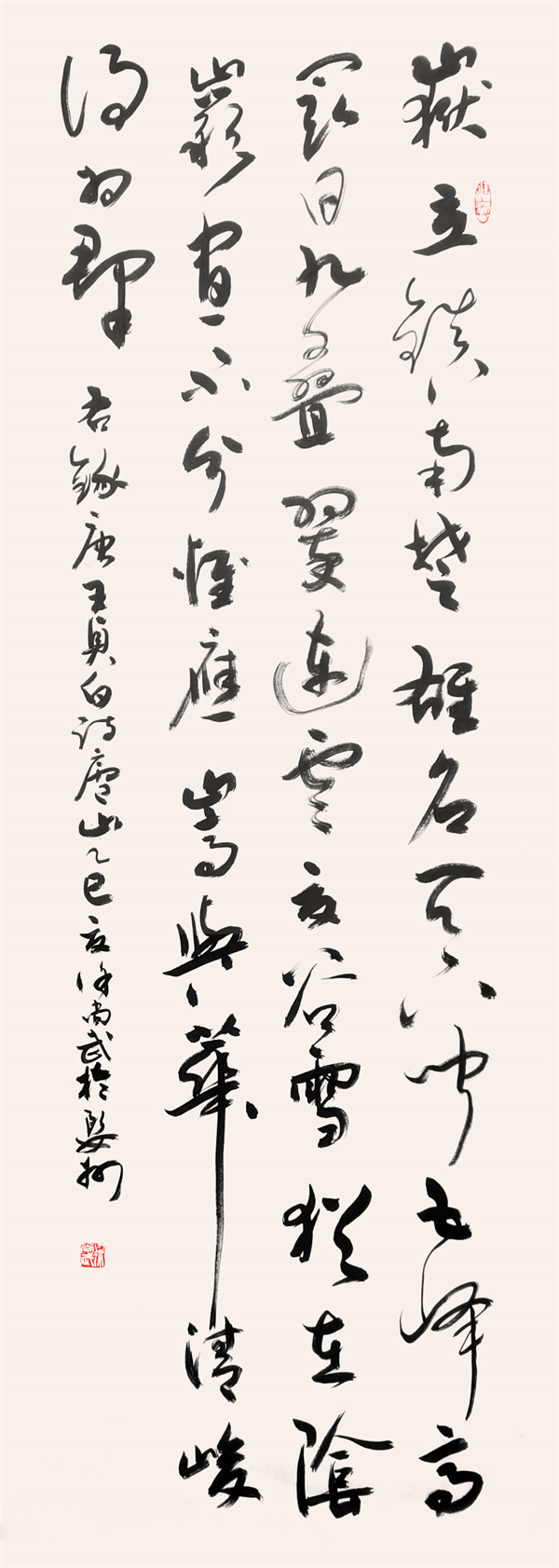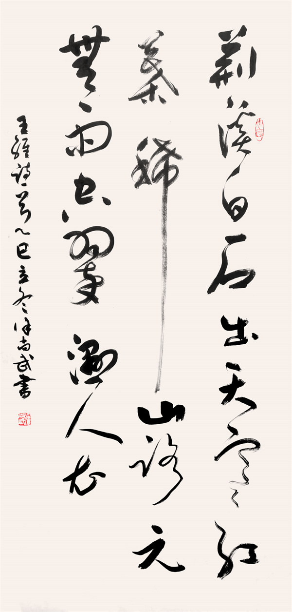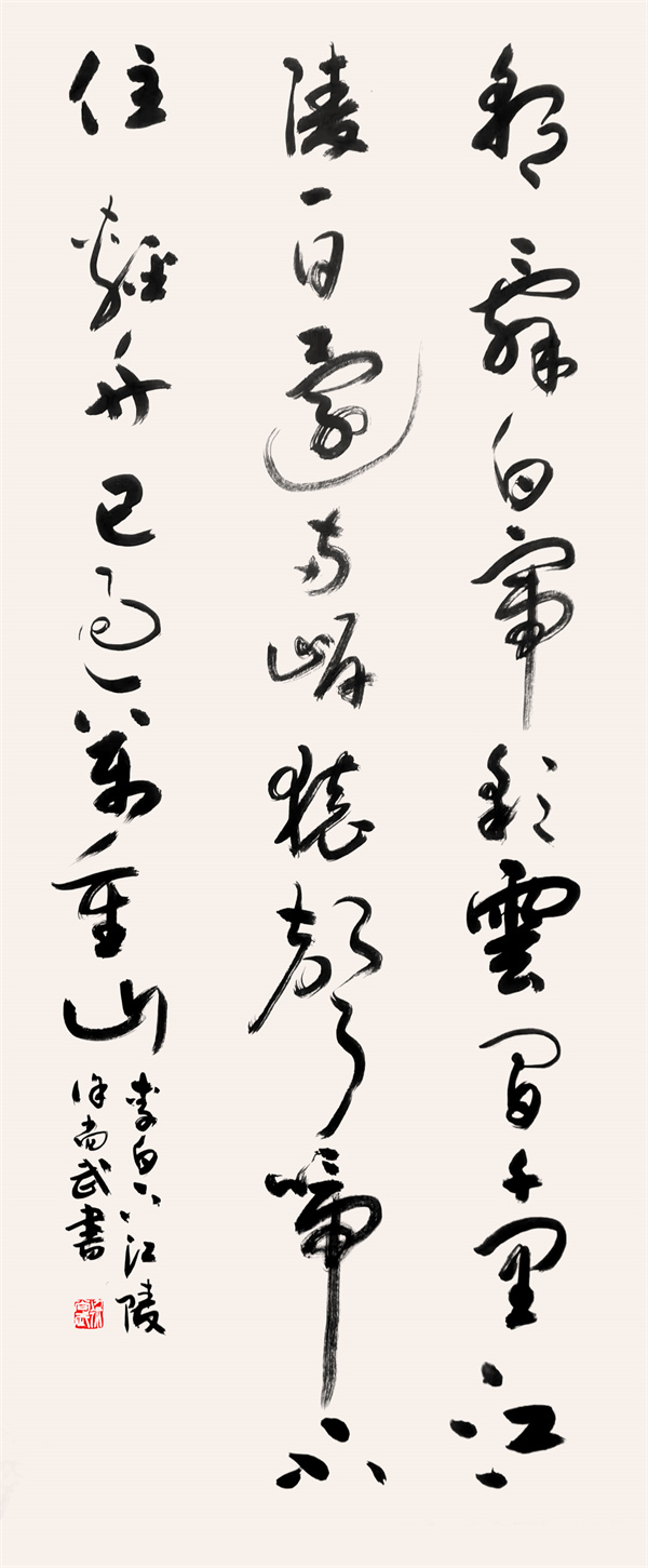 从笔法维度观之,徐尚武深悟 “用笔千古不易” 之理。其作中,起笔藏露兼施,行笔提按顿挫节奏分明,收笔或戛然而止见爽利,或回锋映带显绵劲,如《唐诗草书轴》里,线条的粗细变化、疾徐转换,恰如孙过庭《书谱》所云 “一画之间,变起伏于锋杪;一点之内,殊衄挫于毫芒”,将笔法的精妙微奥演绎得淋漓尽致。这种对笔法本体的精准把握,是其书法立骨传神的根基。
