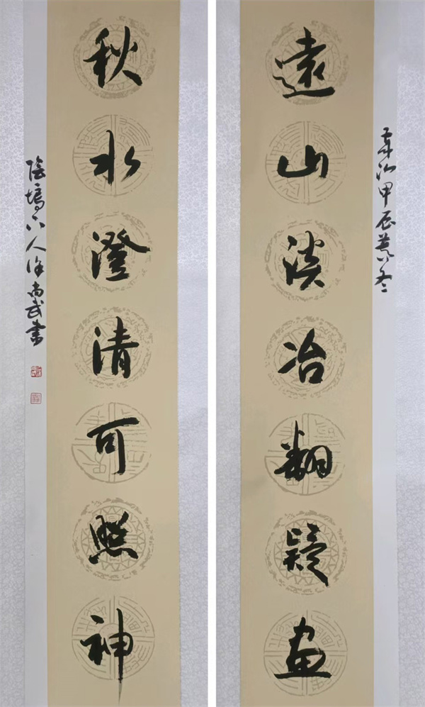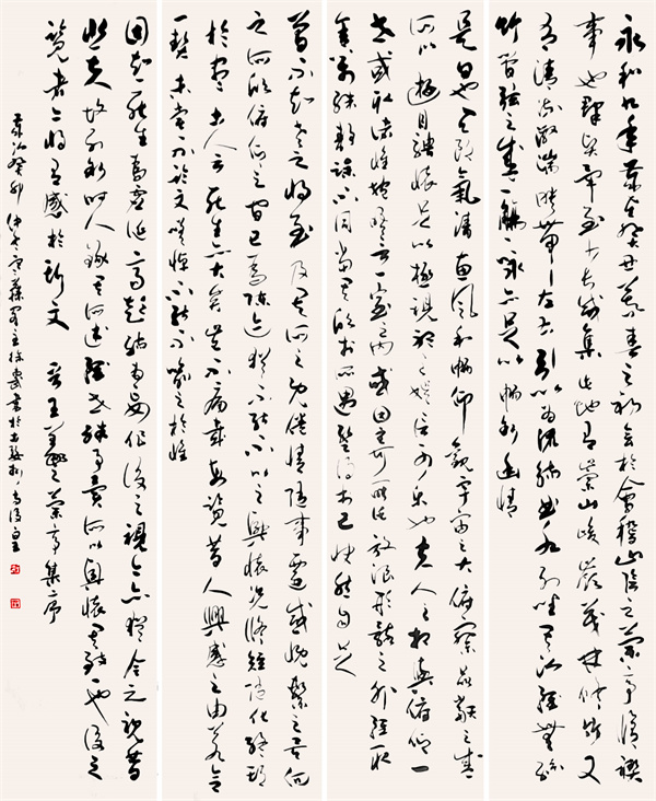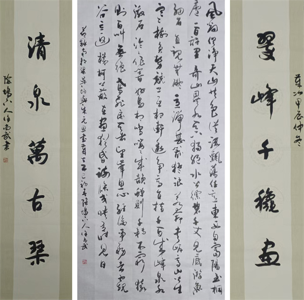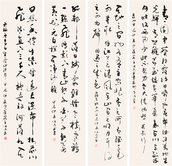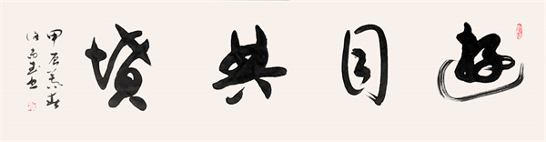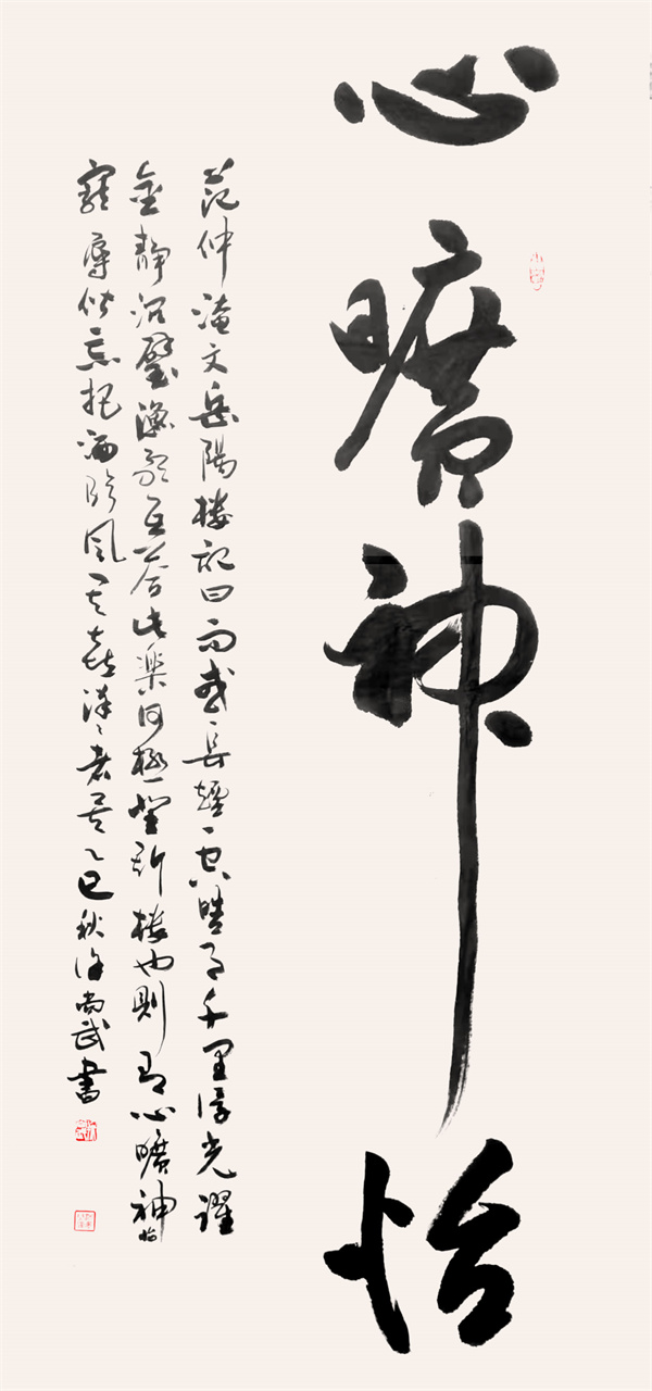 在字法与章法的营构上,他颇得 “经营位置” 之妙。单字结体或欹或正,或收或放,于欹侧中求平正,于聚散间见和谐,如《心旷神怡》榜书,“心” 字开张,“旷”“神”“怡” 字欹侧呼应,气脉连贯。章法布局则大疏大密,错落有致,多幅条屏作品中,字群的疏密对比、墨色的枯润变化,暗合 “一点成一字之规,一字乃终篇之准”(王羲之《笔势论》)的章法要义,营造出或空灵、或沉郁、或跌宕的视觉张力与情感节奏。