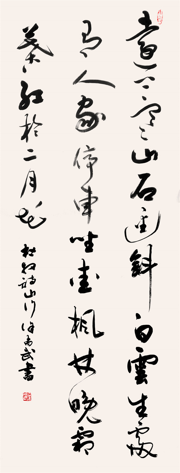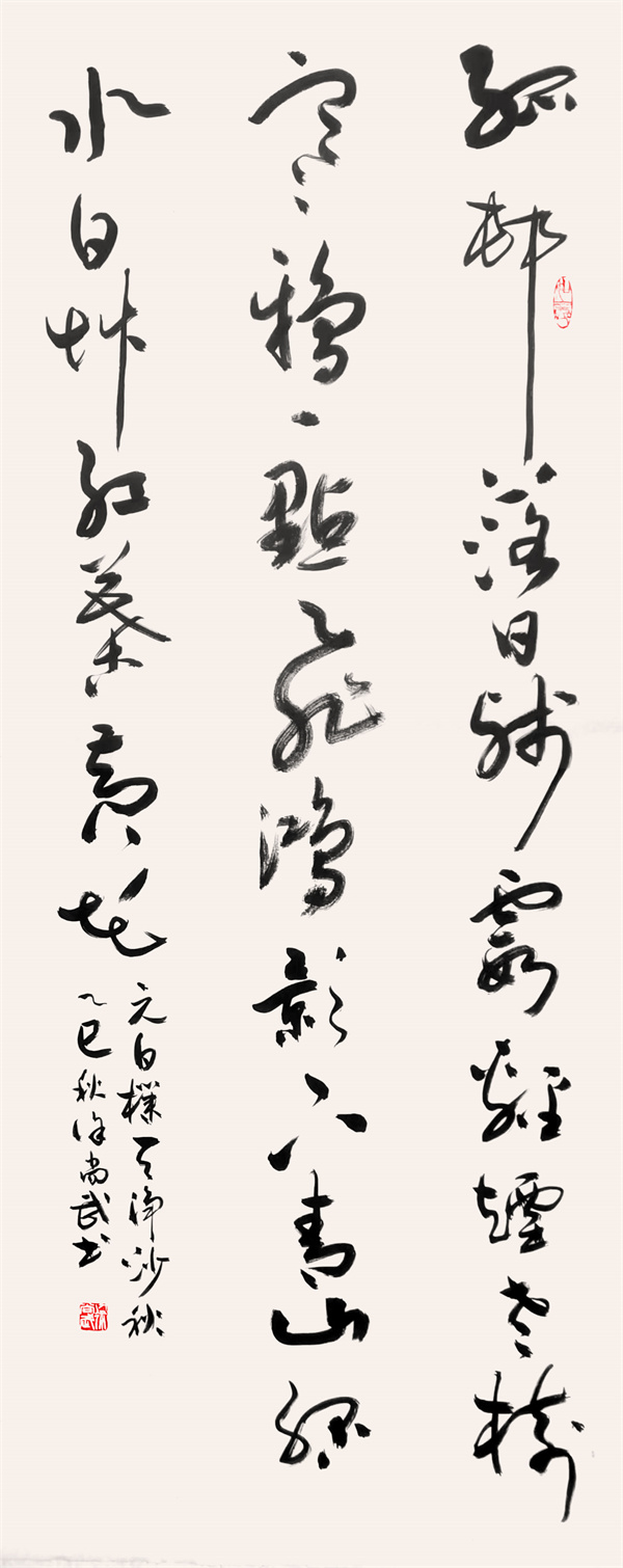 徐尚武的书法最动人处,在于其 “书为心画” 的性情抒发。他的行草作品,笔意纵横,气势酣畅,如《杜牧山行草书轴》,笔墨裹挟着诗意的豪情奔涌,线条的飞动、结体的跳宕,将 “停车坐爱枫林晚” 的悠然意趣外化为视觉的笔墨交响,这正是蔡邕 “书者,散也。欲书先散怀抱,任情恣性,然后书之” 的创作状态的生动诠释。