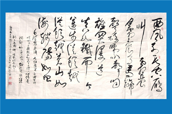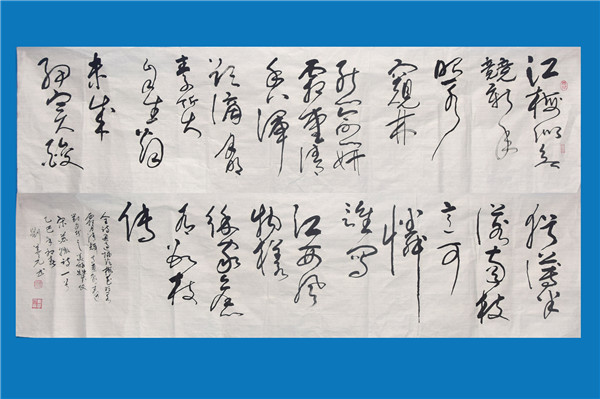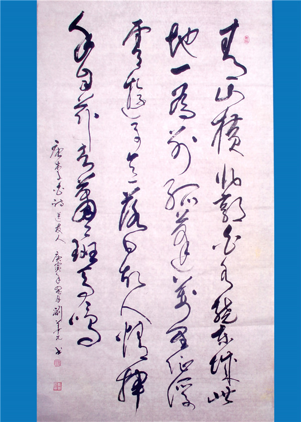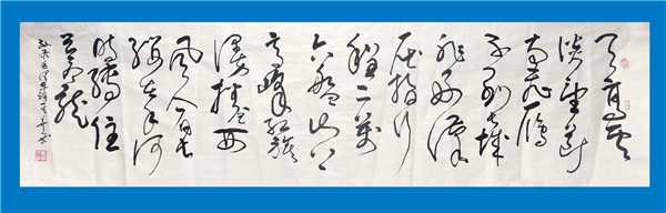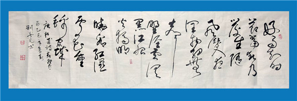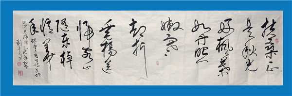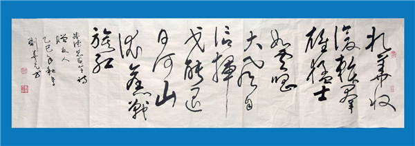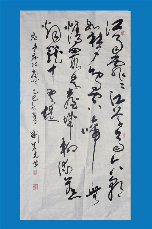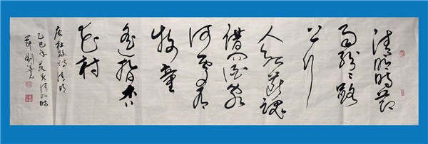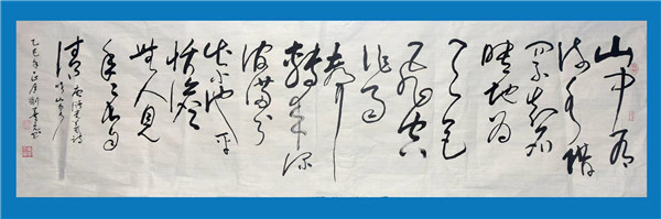 其草书最具风貌,笔下线条如 “万岁枯藤”(卫铄《笔阵图》),既具张旭、怀素狂草的纵逸气度,又暗含对节奏与章法的现代性把握。观其草书作品,笔画使转如惊蛇走虺,结体欹正相生,墨色枯润浓淡间,将唐人诗意(如韦应物、杜牧诗篇)的意境与草书的抒情性交融,形成 “情驰神纵,超逸优游” 的视觉张力,恰是 “书者,心画也”(扬雄《法言》)的鲜活注脚。