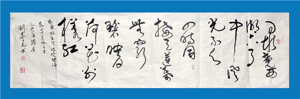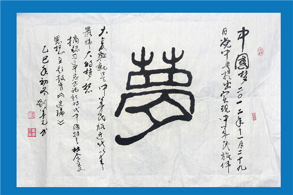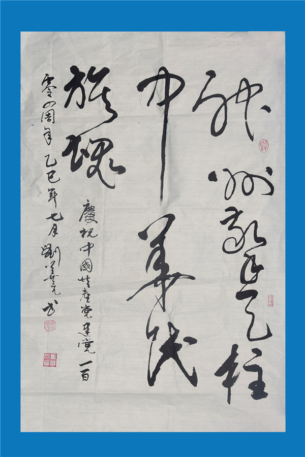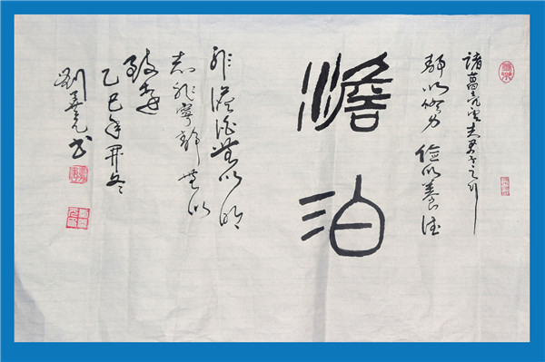 刘善元的书法创作,还暗含着对 “技” 与 “道” 关系的深刻理解。他于诸体中穿梭自如,草书的放达、篆隶的沉凝,既源于对 “永字八法” 等技法体系的长期锤炼,更在于其以书载道的艺术追求。如 “神州豪气在,中华民族魂” 的草书作品,将家国情怀熔铸于笔墨,让书法超越了形式美感,成为精神的载体,这正契合了 “书法者,抒也,散也,抒胸中气,散心中郁也”(蔡邕《笔论》)的艺术本质。