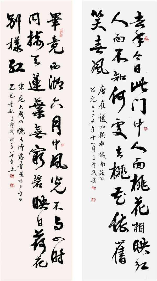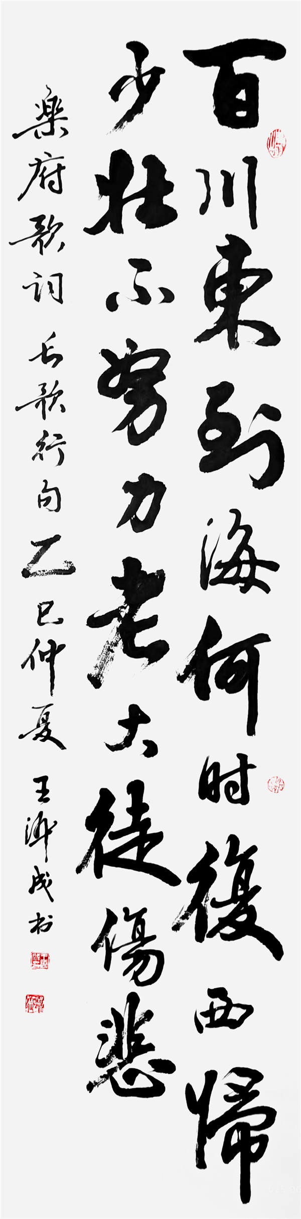 如果说楷书和隶书重点体现着王先生书法“执于法”的特点,那么观览他的行书作品,则可以体验其书法“从于心”的表达。他学习行书,非常重视对兰亭序的读与临!一遍正脚手,二遍得形势,三遍得其本,四遍五遍可以抽拔自如、纵横捭阖!经由对二王法帖的心追手临,所得到的书道法则默于心、透于笔!凌空杀纸,入木三分,把力度与速度控制得特别到位,在师而不拘的塑造中,形成了自家行书“重心平稳,笔力沉雄,结体圆润,舒展挺拔”的新文人风格,与晋代文人书法的天质一脉相承。王羲之《兰亭序》是王淬成学习行书的入门教材,为他的行书打下了坚实的基础;文征明《滕王阁序》紧奏的结字、雄强有力的笔画成就了他晚期行书的风格。受米芾“集古字而自成一家”思想的影响,他爱读、爱查书法字典,取百家之长为他所用,丰富了其行书的用笔和结字。