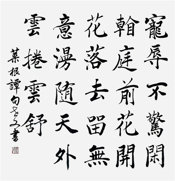 其作品最动人处,是 “书为心画” 的文人气质:书写《菜根谭》联句 “充海阔天高之量,养先忧后乐之心” 时,字形宽博开张,墨色浓淡相间,将文句的襟怀化为笔墨的舒展;而《早梅》诗的行草,以飞白与重墨交错,既写梅之清寒,又藏笔锋之 “锥画沙”,暗合孙过庭 “达其性情,形其哀乐” 的书论内核。