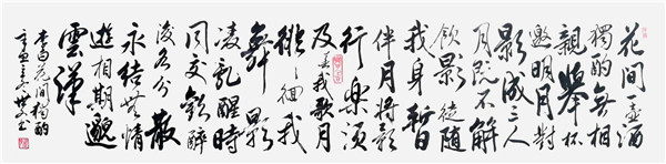 他尤善以书载文,将古典文本的意境与书法形式互映:苏轼词的疏朗、李白诗的俊逸、辛弃疾词的沉雄,皆在其笔墨的开合、疾缓间得到呼应,做到了 “文以载道,书以焕采”。